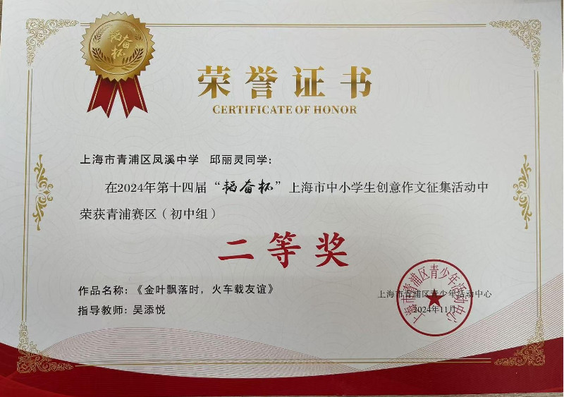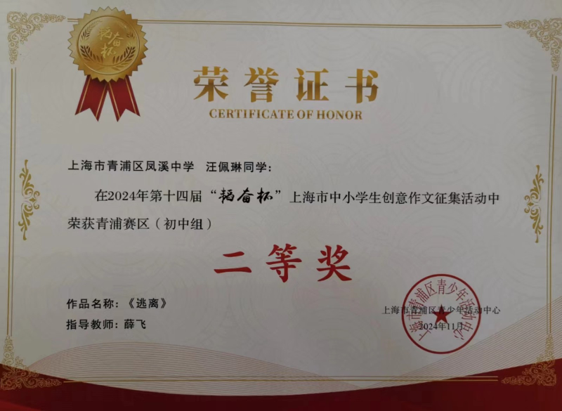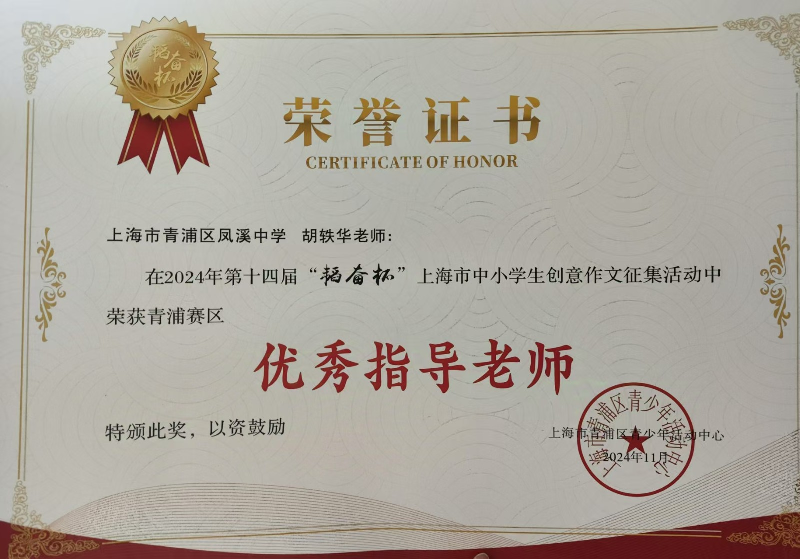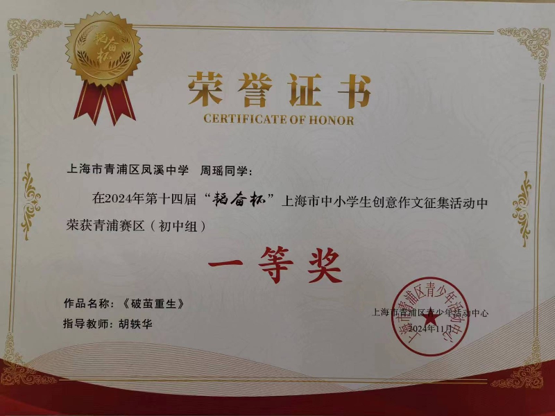 在本届“韬奋杯”创意作文征集活动中我校周瑶同学荣获区一等奖,汪珮琳、邱丽灵两位同学荣获区二等奖,胡轶华老师荣获优秀指导老师称号。