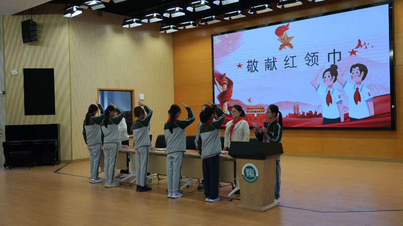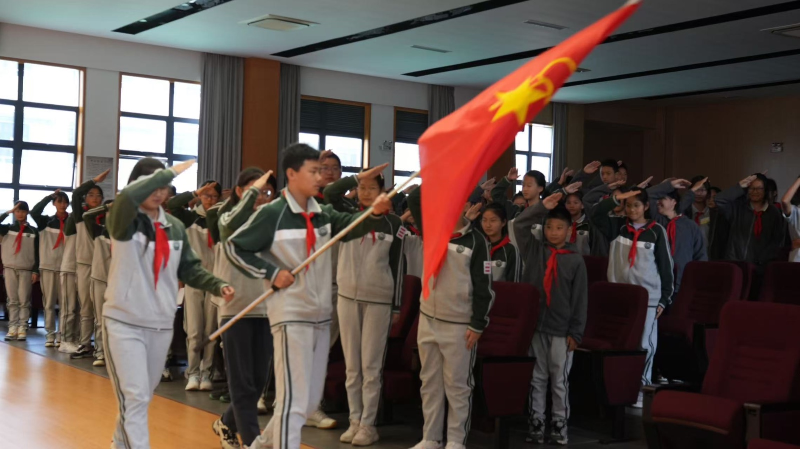 在鲜艳的队旗下,队员们高举右拳,在党支部委员安老师的带领下,全体队员铿锵有力的呼号,响彻整个多功能厅。
