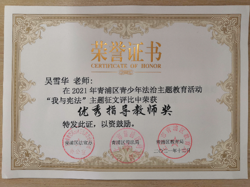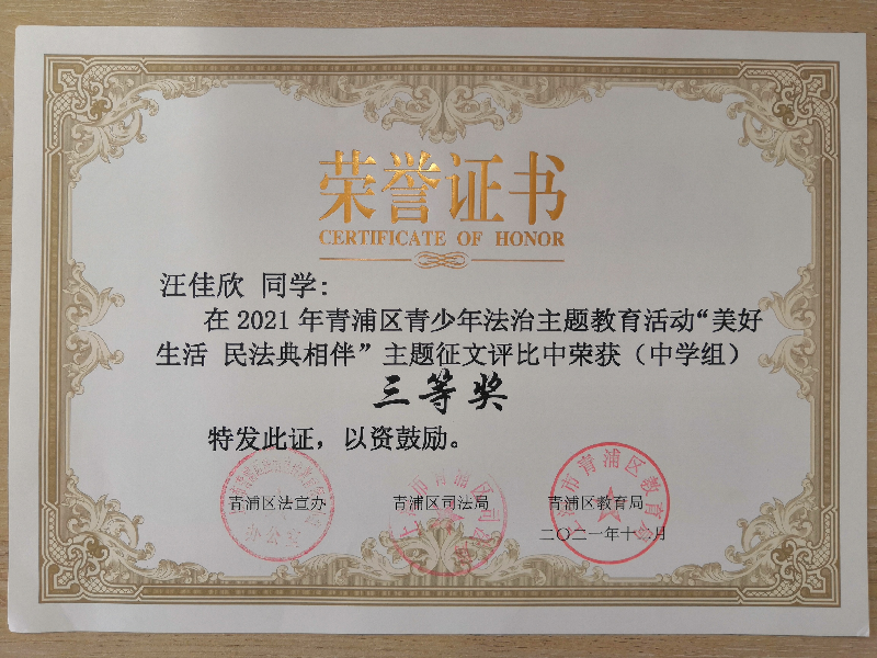 法律与每个人的生活都息息相关,在2021年青浦区青少年法治主题教育活动主题征文评比中,凤溪中学的同学们积极学习并参与,收获了法律知识,提升了法律素养。其中由吴雪华老师指导的八2班的张奥佳同学荣获“我与宪法”主题征文二等奖,八4班的汪佳欣同学荣获“美好生活 民法典相伴”主题征文三等奖。吴雪华老师荣获优秀指导老师奖。