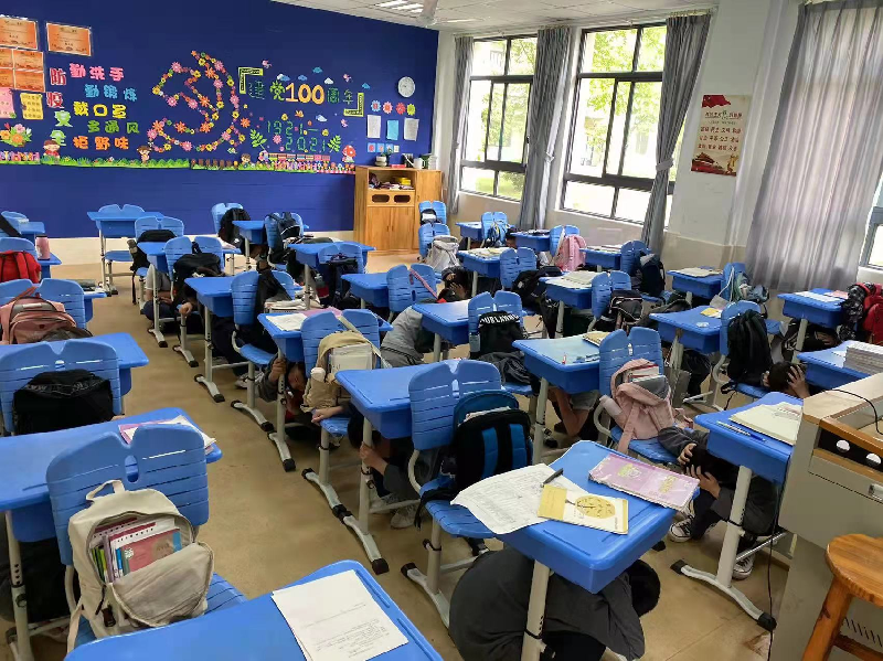 演练开始前,总指挥刘老师帮助学生复习了应急避震的保护措施,提醒学生先就地避震,后逃生撤离,撤离过程中也要注意保护头部。随着警报声响起,各班学生迅速躲在坚固的课桌下面,做好避震工作。随后再按照规定路线,有序地撤离教学楼。到达安全地点后,再清点各班人数并上报。从演练情况来看,大部分学生就地避震动作比较规范,但一些班级学生没有进行就地避震,直接撤离教学楼,在疏散过程中,也没有护住头部,避险动作不规范,撤离不够迅速,需要改进。