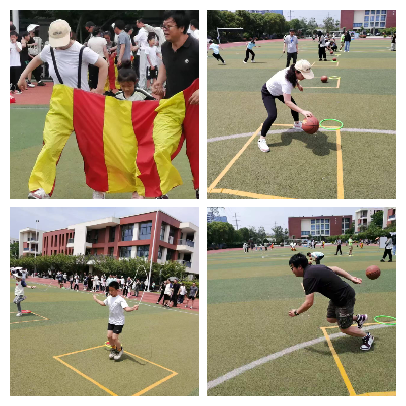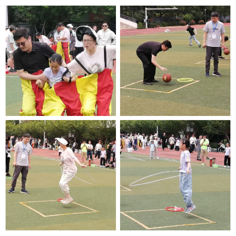 两组教职工家庭参与的趣味赛中,亲子组合在趣味接力、齐心协力、飞镖等项目中默契配合:趣味接力里,家长托球稳、孩子跳绳欢,击掌环节充满温情;齐心协力项目中,三人同穿连体道具同步前行,调整步伐间洋溢着互动乐趣;飞镖投掷时,教职工稳健瞄准、孩子认真尝试,全家共同计数讨论,在轻松氛围中完成挑战。
