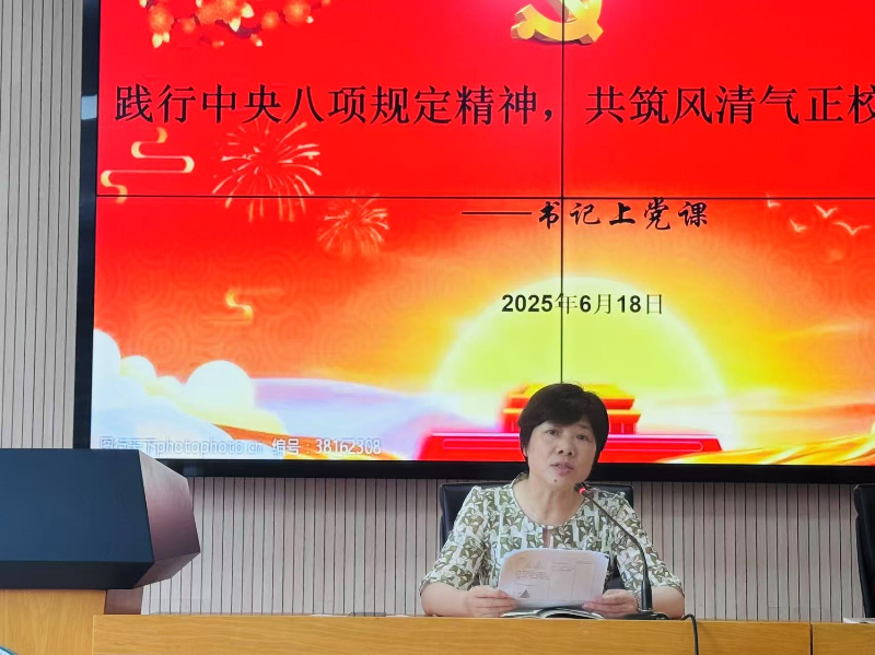 党支部书记戴红为全体党员带来主题为“践行中央八项规定精神,共筑风清气正校园生态”的生动党课。戴书记从深刻领悟核心要义,筑牢思想根基;紧密联系教育实际,践行廉洁从教;发挥先锋模范作用,强化监督执纪三个方面展开阐释。戴书记结合校园廉洁风险易发环节及防控要点对全体党员、干部进行提醒,要求全体党员干部牢记党员身份,遵守党规党纪,进一步提高政治站位,强化纪律意识,锤炼严实作风,将中央八项规定精神铭刻于心、落实于行,做到心有所畏、言有所戒、行有所止。