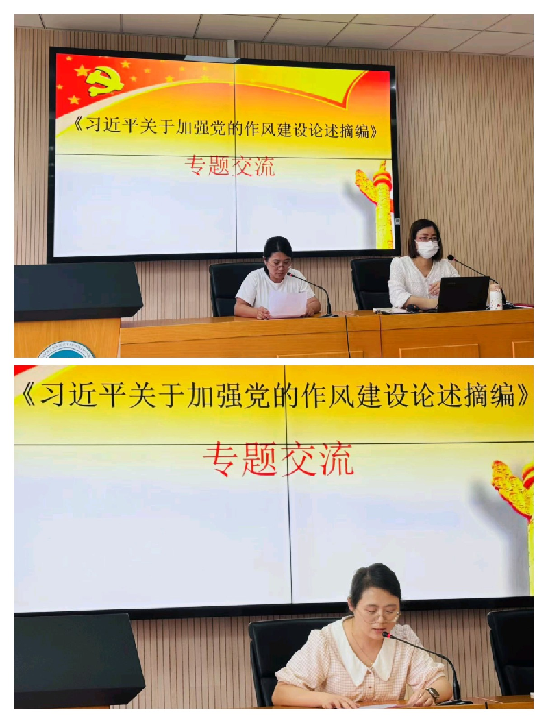 为坚定理想信念,强化党员教师党性修养和政治觉悟,开展学习《习近平关于加强党的作风建设论述摘编》专题交流。党员代表杨玲、倪诗文结合自己的教育教学实际交流学习心得。杨玲老师指出,作为党员教师要密切联系自己的学生,关注学生的学习状态、思想动态、生活状况,走进学生心灵,心系学生。同时,教育教学工作中要做好批评和自我批评,一方面要主动反思,另一方面要勇于接受来自同事、家长、学生的不同意见,不断完善自己。倪诗文老师结合自己作为班主任和英语教师的双重身份,建立"三走进"工作法、开展班级组织生活会、创设"红色主题情境教学",将党的优良作风转化为教书育人的具体实践。她们在用最朴实的方式传承红色基因,在用"润物细无声"的坚守,在平凡的岗位上书写不平凡的教育篇章。