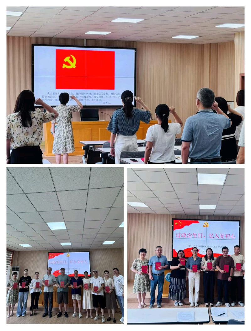 党支部书记戴红和副书记安黎黎,为全体党员发放政治生日贺卡。戴书记代表党支部为全体党员送上政治生日祝福:愿大家的理想信念如磐石般坚定,永远不忘初心,牢记使命,为中国人民谋幸福,为中华民族谋复兴。并带领全体党员重温入党誓词。