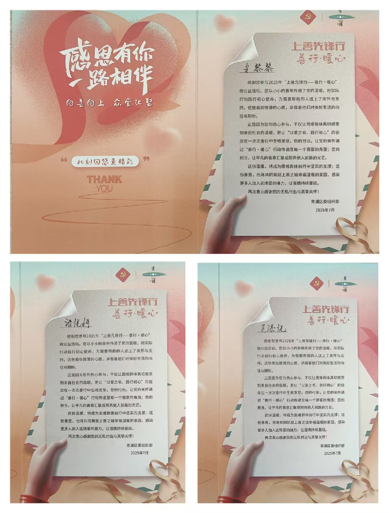 在庆祝中国共产党成立104周年之际,区委组织部、区委社会工作部联合发起了“上善先锋行——善行•暖心”微公益活动。我校党组织积极响应,安黎黎、吴添悦、诸悦婷三位党员老师成功认领微心愿并精心落实。近日,三位党员老师收到了情真意切的感谢信,来信对我校党员同志热心公益、服务群众的善行义举给予了高度赞扬和诚挚感谢。