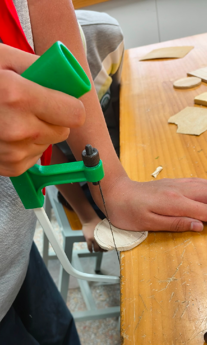 课堂伊始,曾老师以“回顾陀螺制作流程”为切入点,迅速将学生带入实践情境。围绕“如何精准加工陀螺转盘”,课程聚焦三大核心任务展开:一是“木板尺寸图绘制”,曾老师通过“转盘画在桐木板什么位置”“圆心怎样标注清晰”等问题引导,帮助学生理解尺寸标注的准确性对后续制作的影响,学生们纷纷拿起圆规、直尺,在桐木板上认真绘制出规范的陀螺转盘尺寸图;二是“曲线锯规范锯割”,针对陀螺转盘的圆形切割需求,曾老师详细演示曲线锯的使用方法,强调“锯条垂直”“圆形起锯位置”等操作要点,同时反复提醒工具使用安全,学生们在老师的指导下,规范地操作曲线锯,逐步掌握圆形锯割技巧,确保切割出的转盘边缘整齐;三是“转盘精细打磨”,曾老师通过对比粗磨、精细打磨的效果,让学生明确打磨的目的与方法,指导大家从粗磨去除木刺,到精细打磨优化表面光滑度,学生们分工合作,及时清理木屑,保持操作桌面整洁,最终顺利完成陀螺转盘的打磨任务。