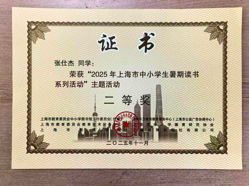 在“2025年上海市中小学生暑假读书系列”主题活动中,九(2)班张仕杰荣获二等奖!