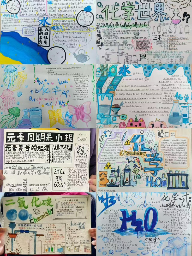 课堂上的理论知识,终究要在实践中绽放光彩。“无书面作业日”当天,学生们化身为“小小科学家”“创意小编辑”,开启了多元化学探索之旅。选择趣味实验的同学,利用食醋、鸡蛋壳、花瓣等生活常见材料,自主完成实验设计与操作:观察鸡蛋壳与食醋反应时的气泡冒出,记录自制酸碱指示剂遇不同溶液的变色现象,在动手操作中感受化学与生活的紧密联系;投身小报创编的同学,围绕“身边的化学”“化学与生活”等主题,将课本知识与生活实例结合,精心排版、手绘插图,用生动文字解读化学原理;参与模型制作的同学,用橡皮泥捏制原子结构、分子结构模型,让抽象的微观世界变得直观可感,在塑形过程中深化对化学概念的理解。