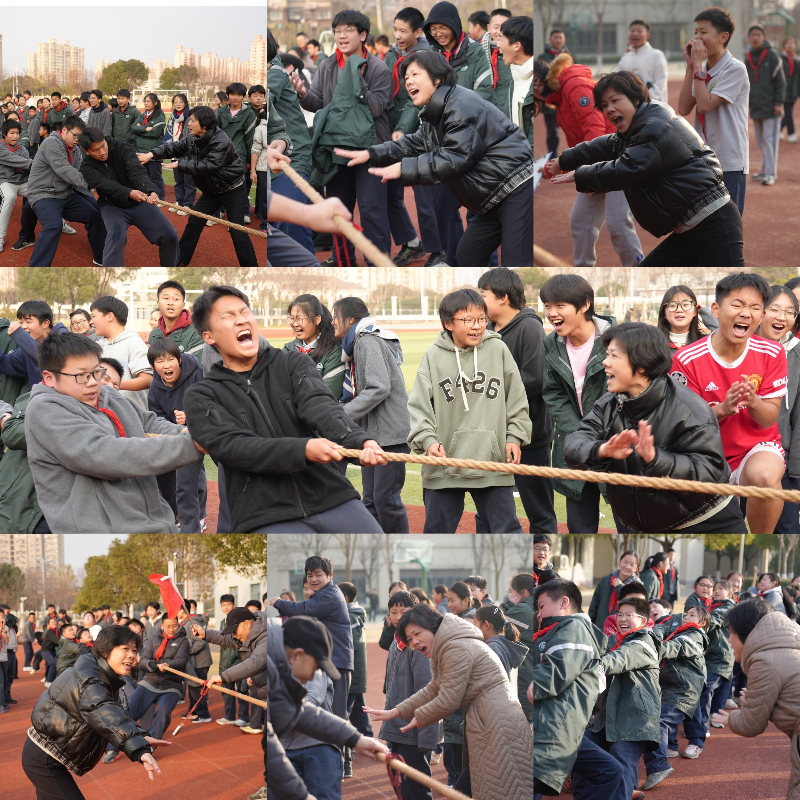 赛场上,队员们攥紧麻绳、身体后倾,塑胶跑道印满用力的鞋印;班主任们有的攥拳喊号子,有的干脆加入队伍并肩拉绳,有学生笑称 “班主任下场当‘编外队员’,这波师生 buff 直接叠满”;校长也站在边线旁挥手鼓劲,有同学偷偷说 “校长喊‘加油’的嗓门,比我们拉绳的劲儿还足”。场边啦啦队举着班旗,红底黄字的旗帜被风掀得猎猎响。加油声裹着寒气撞过来,像裹了层热乎的糖衣 —— 有人攥着嗓子喊到脸通红,有人拍着巴掌蹦跳。连围在旁边的围观同学,都跟着跺脚打拍子,那股热乎劲儿顺着跑道往四周漫,把冬日的冷都烘得软了几分。