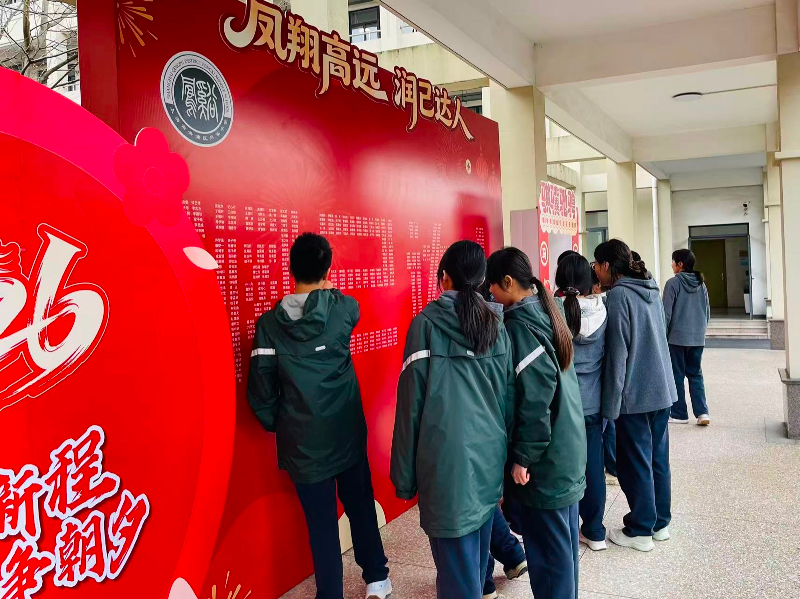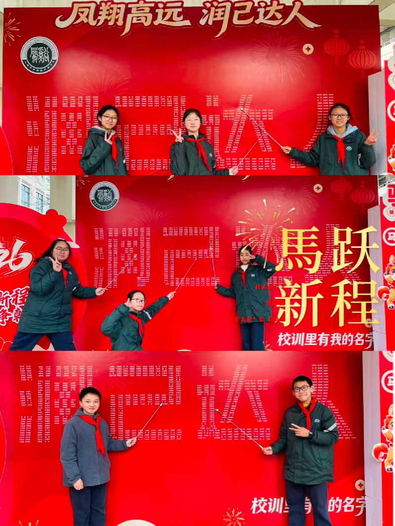 开学典礼后,校园内开展“校训里有我的名字”特色互动活动,成为新学期一道温暖的风景线。在“润己达人”校训展示牌前,队员们有序排队合影,仔细探寻拼嵌在校训中的自己的名字,在趣味寻找中感悟“凤翔高远 润己达人”的校训内涵。现场还设置“我们开学啦”马年创意相框,队员们或独自留影,或与同窗结伴合照,一张张笑脸定格着新学期的期待与憧憬,让校训精神在沉浸式互动中浸润心灵,引导队员们以校训为准则,在成长中修己达人、向善向美。