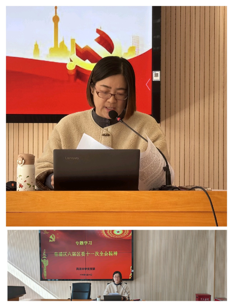 党支部副书记安黎黎带领全体党员专题学习青浦区六届区委十一次全会精神,结合学校工作实际,深入解读全会关于教育领域的部署要求,引导党员准确把握精神实质。要求党员们聚焦 "如何将全会精神融入教育教学、师德师风建设、学生培养" 等核心议题,进行深刻思考并融入实践。大家一致表示,要把学习成果转化为工作动力,立足教学岗位,强化责任担当,创新教学方法,提升育人质效,以实际行动落实全会精神,助力学校教育事业高质量发展。